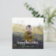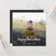 Foto simples, na moda personalizada Cartão de Dia das Bruxas Feliz com a moderna tipografia de script minimalista e um simples gradiente preto. A foto e o texto podem ser facilmente personalizados para um design tão único quanto a sua família especial! A imagem mostrada é apenas para fins de ilustração para ser substituída pela sua própria foto. A imagem marcante é de uma adorável menina vestindo um vestido e uma faixa de cabeceira amarela verde, sentada em um parque em um prato de piquenique entre as folhas do outono do outono. #halloween #cartão #foto #quadrado