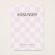 Placa de exibição com um padrão de verificação lilás fofo. Os orifícios de modelo podem ser ajustados ou excluídos, bem como todas as informações de sua empresa. Adicione sua mídia social ou site à parte inferior.