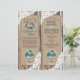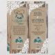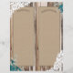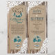 Madeira russa com rendas brancas e buquê floral azul de hálito de bebê em jarro de mason com burlap, rendas e trims gêmeos sobre fundo de texto de linen e gravações cardíacas com programa de casamento no estilo do país do monograma.