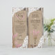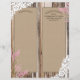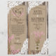 Madeira russa com rendas brancas e buquê rosa-lavanda em jarro de mason com burlap, rendas e trims gêmeos sobre fundo de texto de linen e gravações cardíacas com programa de casamento no estilo do país de monograma.