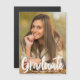 Formando é escrito em branco manuscrito sobre sua foto de retrato do mais velho, que faz um ímã chic, moderno, de anúncio de graduação. Personalize com seu nome e segundo grau ou classe universitária de 2025 sob a tipografia em negrito e adicione seus detalhes pessoais na parte de trás desses cartões magnéticos formandos de camada de texto elegante.