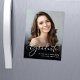 Este anúncio elegante de manutenção magnética de graduação mostra a foto do formando com "Formando" gravada em uma escrita na moda-branca e seu nome, ano escolar e de aula em uma simples tipografia branca.