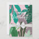 Cartão floral "Feliz Aniversário", moderno e elegante. Apresenta plantas tropicais, folhas e flores, letras brancas de guião e espaço no verso para uma mensagem especial. Para solicitações especiais, sinta-se à vontade para enviar uma mensagem ao compro de designs personalizados, ou seja, layout, cor ou tema.