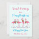 Cartão de saudação de Natal tropical com flamingos festivos e texto personalizado. O design, impresso em placas planas 5x7, tem quatro flamingos entre pequenos estrelas azuis. Vestem hibisco festivo e mortes sagradas. Um exemplo de texto, na moderna letra escrita à mão, diz: "Seas e saudações para um Feliz Natal e Feliz ano novo" com assinatura na parte inferior. O reverso é azul aqua sólido. Perfeito para enviar de uma família ou grupo em um local tropical.