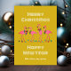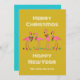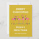 Cartão de saudação de Natal tropical com flamingos festivos e texto personalizado. Cartões planos azuis de Aqua têm quatro flamingos entre estrelas pequenas. Vestem hibisco festivo e mortes sagradas. Uma borda fina de cor-de-rosa reduz a placa 5x7 in. e todas as linhas de texto são fáceis de alterar ou excluir. A amostra diz: "Seas e saudações para um Feliz Natal e Feliz ano novo" com assinatura no final. O reverso é cor-de-rosa sólido. Perfeito para enviar de uma família ou grupo em um local tropical.