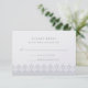 Projetado para coordenar com nossos convites para casamento e evento árabes, este cartão de resposta elegante em branco de pérolas luminoso e cinza de prata apresenta uma fronteira geométrica inferior inspirada por Marrocos. Adicione sua data de RSVP e responda ao texto em cinzas médias. Recomendamos a impressão deste estilo no papel Luxe Pearl Shimmer para um acabamento metálico suave.