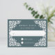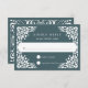 Projetado para coordenar com nossa coleção de casamento Beaux Arts, esta elegante placa RSVP apresenta papel picado fronteira branca moldando sua data de resposta desejada e a sua aceitação e decepção personalizadas, em um rico fundo verde spruce.