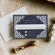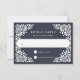 Projetado para coordenar com nossa coleção de casamento Beaux Arts, esta elegante placa RSVP apresenta papel picado borda branca moldando sua data de resposta desejada e o texto de aceitação e recusa personalizados. Um rico fundo azul-da-meia-noite adiciona uma elegância dramática.