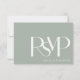 Os simples cartões de resposta RSVP de 5 pol x 3,5 pol de casamento apresentam a palavra, RSVP em letras grandes de abstrato em branco em sábado empoeirado. A parte traseira tem espaços reservados com linhas para o convidado preencher seu nome e selecionar sua escolha para participar.