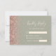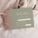 A borda esquerda desta elegante placa de caixa RSVP de casamento moderna apresenta uma borda falsa rosa dourada. O texto personalizável combina manuscrito de marfim, fontes em copperplate e itálico em um fundo verde de sábio. O verso apresenta um design verde-sábio e rosa dourado correspondente.
