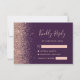 A borda esquerda desta elegante placa de caixa RSVP de casamento moderna apresenta uma borda falsa rosa dourada. O texto personalizável combina letras rosa pálidas, letras em copperplate e fontes itálicas em um fundo roxo escuro. O verso apresenta um design de ouro roxo e rosa.