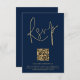 Cartão RSVP de Casamento de Código Qr de Marinho Azul de Script Dourado Elegante. Um gabinete de opções conveniente para pedir aos seus convidados que digitalizem o seu código QR para o seu site de casamento para RSVP. Uma tipografia na moda em ouro para o título principal RSVP complementando o resto do texto que você pode personalizar facilmente.