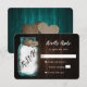 Cartão RSVP de Casamento de Teal Russo apresentando um jarro de pedreiro e dois corações de burlap com iniciais contra um fundo de madeira rústica. Personalize facilmente esta bela placa RSVP rustical on-line.