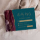 A borda esquerda deste elegante cartão de cercado RSVP de casamento moderno apresenta uma borda de cor d'água borrifada, aparada com falso brilho dourado. O título "Resposta gentil" aparece em script de escrita manual, com texto personalizável abaixo na letra de impressão dourada sobre um fundo especial. O lado inverso apresenta uma burgundy e uma design de agata dourada.