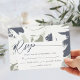 Esses cartões de resposta RSVP de casamento leves e ávidos de 5" x 3,5" apresentam um design de folha abstrato em tons de sábio e marinho com linhas para o convidado preencher seu nome e selecionar sua escolha para participar.