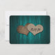 Cartões RSVP de Casamento de Teal Russo apresentando um jarro de mason e corações de burlap contra um fundo de madeira rústica. Personalize facilmente esta bela placa RSVP rustical on-line. Itens correspondentes disponíveis para complementar este cartão RSVP de casamento rústico romântico.