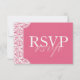 Este cartão de resposta de convite de casamento personalizável é um tom bonito de rosa em uma cor damasco clássica com as informações solicitadas sobre RSVP. O lado do sacudir tem a sigla "rsvp" duas vezes em dois tons de rosa rosado. Ele é totalmente personalizável para personalizar, de acordo com as suas necessidades. dam001