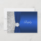 Este elegante cartão de resposta de casamento tema damasco azul e cinza prateado, azul, marinho, com fita impressa e medalhão de joias IMPRESSAS com monograma é mostrado aqui em papel básico. Corresponde ao convite de casamento mostrado abaixo. ****POR FAVOR, OBSERVE que não há gravações neste cartão ou imagens levantadas. Tudo é plano. Se você precisar de itens correspondentes, como cartões de agradecimento, programas etc., envie seu pedido por e-mail para niteowlstudio@gmail.com.
