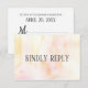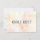 Cartão de resposta RSVP elegante e minimalista. A frente tem um padrão de ouro e abstrato cor-de-rosa suave. A gentileza de responder é escrita em uma bela e simples fonte. Os detalhes da resposta estão no verso. Fonte simples e limpa em branco.