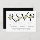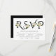 A tipografia branca e preta elegante e o cartão RSVP de rosas brancas com opção de refeição. Este elegante design de casamento exibe o "RSVP" em uma fonte decorativa de alivio em preto com rosas brancas. O dorso é de cor preta sólida.