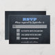 Estas Cartões RSVP rústicas são perfeitas para qualquer celebração do Bar Mitzvah. Cada linha de texto é perfeitamente personalizável para dizer exatamente o que você quer! O texto no verso permite que os convidados escolham uma entrada (pode ser totalmente personalizada) Produtos correspondentes disponíveis na Coleção Mitzvah, Bar Azul do Quadro Chalkboard.