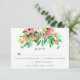 Esta bela placa floral tropical RSVP apresenta um buquê tropical exuberante de flores aquáticas e verde. O cartão RSVP floral inclui corais e flores cor-de-rosa com folhas tropicais verdes esmeraldas. A cor na parte traseira da placa é editável (mostrada como azul turquesa). A papelaria de casamento está disponível na nossa coleção de casamento Tropical Floral.