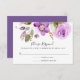 Coordena-se com a nossa coleção de casamento Lilac Blooms, esta placa RSVP apresenta uma abertura de flores aquáticas em lilás, cor-de-rosa suave e cinzas, enfeitando sua data de resposta desejada e personalizando a aceitação e o declínio do texto.