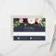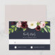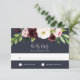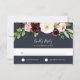 O cartão Elegante de RSVP floral de aquarelas apresenta um aglomerado de flores cor-de-rosa pincel, burgundy marsala e marfim acentuadas com uma cor verde-esbranquiçada de folhagem botânica. Personalize com a data de RSVP desejada, bem como aceite e recuse a redação em um fundo azul rico em marinho. Projetado para combinar o nosso casamento Blush Romance e Midnight Romance e a coleção de eventos especiais.