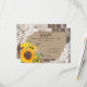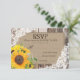 Girassóis com rendas brancas sobre fundo de olho de linho e planaltos de madeira de celeiro do país rústico design de cartão RSVP de casamento ocidental.