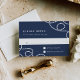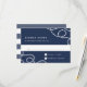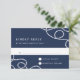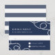 O cartão RSVP de casamento costeiro Elegante apresenta a data de resposta desejada e o texto de aceitação/declínio personalizado em branco sobre um fundo azul marinho, acentuado nos cantos com laços de corda náutica trançada. Cartões à volta de faixas náuticas largas.
