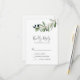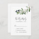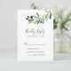 Este simples cartão RSVP do ramo de oliveira moderno é perfeito para um casamento de boho. O design rústico, porém elegante, apresenta folhas botânicas de cor aquática simples e azeitonas pretas num pequeno galho com um toque mediterrânico clássico.