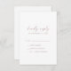 Este simples cartão RSVP de guião rosa é perfeito para um casamento minimalista. O simples design cor-de-rosa-rosa-rosa-claro apresenta uma tipografia exclusiva de letras industriais com estilo boho moderno. Personalizável em qualquer cor. Mantenha o design mínimo e elegante, como está, ou personalize-o adicionando seus próprios gráficos e trabalhos de arte.