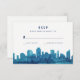 Essas placas rsvp modernas e estilizadas apresentam uma linha do horizonte de cidade com cores aquáticas pintada manualmente em azul marinho e lacre.