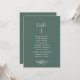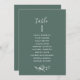 Ajude seus convidados a encontrar sua mesa com esses elegantes cartões de lugar de mesa verde com nomes de convidados. Cartões duplos para que os hóspedes possam procurar os seus nomes, tanto na frente como no verso. Espaço livre ao redor, dando-lhe a liberdade de usar clipes ou furos de socos para exibições suspensas, ou usar um mesa/quadro. O design tem um fundo verde profundo, texto branco, delicado detalhe floral desenhado à mão em branco e detalhes caligráficos manuscritos. Várias opções de cores. Ter todos os números de tabela na mesma cor ou cores misturadas de acordo com o tema de cor do evento. Parte de uma coleção com uma variedade de produtos de coordenação disponíveis, incluindo cartões de números de tabela e menus.