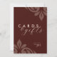 Combine a elegância clássica e a sofisticação moderna com este cartão de sinalização de mesa 'cartões e presentes' de casamento com uma ilustração damask desenhada à mão. Escolha uma cor que reflita seu estilo e simplesmente personalize com seus detalhes. Por favor, certifique-se de ter selecionado o tamanho desejado antes de adicionar o cartão ao seu carrinho.