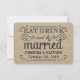 Coma, Beba, e seja casado — Cartões de resposta RSVP de convite para casamento, estilo Vintage, estilo rústico, e entrelaçados, roxos e antigos, gravados, parecem tipografia de recorte de madeira em preto no estilo de pano-de-coleira natural. Adicione os nomes da noiva e noiva e os detalhes do casamento neste modelo fácil de usar. É possível modificar facilmente o estilo original, mas elegante e caprichoso e retrô-escrita para os seus temas de casamento formais ou semiformais. O estilo casual moderno é perfeito para casamentos românticos modernos modernos de tendências com um toque divertido de encanto sofisticado para casais tradicionais. Entre em contato conosco para obter ajuda com a personalização se precisar de mais espaço para seus detalhes de casamento. Outros tamanhos e estilos disponíveis, além da coordenação de postagens, acessórios de noiva, favores de chá e essências de pacotes de casamento para noivas de maricas em um orçamento. Nota: Esta é uma placa de papel com uma imagem IMPRESSA para efeito decorativo. Não há texturas reais ou erguidas.
