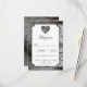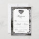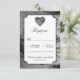 Cartões RSVP de Casamento de Latido de Árvore de Coração de Corte - apresenta uma caixa de texto branca sobre um fundo de latido de árvore de pássaros. A parte traseira apresenta o mesmo plano de fundo do latido de pássaro. Os textos apresentam uma mistura ou um roteiro elegante e fontes padrão em cores pretas e cinzas.