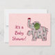 Personalize acrescentando o nome do bebê a este belo convite de chá de fraldas, estilo country, com uma imagem de uma colcha como um padrão floral, elefante rosa com orelhas verdes. Conjuntos de festas de bebês e guardas personalizadas do tema correspondente disponíveis no PhotoographicTKDesign.