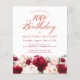 Rosas vermelhas e peônias cor-de-rosa-claro estão aninhadas em folhas verdes-escuras neste belo e único convite de aniversário.