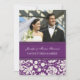 cartões com fotos de anúncio de casamento em elegante berinjela roxa escura e creme de cor damasco floral clássica branca, totalmente personalizável com seus nomes, fotos de casamento e detalhes de casamento, a maneira perfeita de anunciar seu casamento para amigos e familiares. Disponível em uma grande variedade de produtos de casamento correspondentes.
