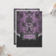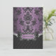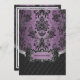 Plum Lapis Purple & Black Casamento tema damasco Invitations — correspondem às placas RSVP encontradas na parte inferior desta página. Cada convite apresenta um elegante e mais candelabro como impressão úmido em preto e roxo no topo com um impressão de travesseiro de luxo, também em preto no fundo. A parte superior e inferior são separadas por uma banda decorativa de prata e de cor preta, para adição de talho. A banda tem um modelo que permite que os nomes de noivas e noivos sejam impressos em cima dela. Estes convites para casamentos tema damasco de candelabro/preto roxos estão preparados para um stock de cartão básico de alta qualidade; entretanto, você pode mudar o estoque para linho, feltro (gravado), reciclado e várias tonalidades metálicas se quiser com o número 2 (escolha seu estilo, tamanho e tipo de papel) abaixo do botão laranja adicionar ao carrinho. Também nessa opção é apresentada uma lista dos custos adicionais de uma reserva de cartão mais antiga. Cada convite tem um envelope branco.