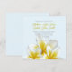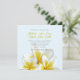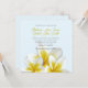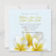 Convites florais de casamento de praia. Flores tropicais de plumeria de branco sobre fundo azul claro. Papel quadrado com cinza escura, texto impresso. Os nomes se destacam em um script ouro amarelo, combinado com o ampersand.