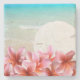 Porta copos de pedra tropical com flores de plumeria rosa e um grande dólar de areia branca. Água azul bonito do oceano é a imagem de fundo.