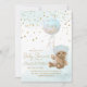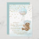 Um bebê urso segurando um balão azul com a frase "mal podemos esperar". Glitter de ouro simulado.