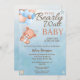 O adorável convite para Chás de fraldas de espera é perfeito para a futura mãe e pai. O design azul e branco é moderno e contemporâneo. O cartão é feito de fardos pesados, pelo que irá durar anos. Adicione seus detalhes de chá de fraldas a este urso fofo com balões azuis e beges.