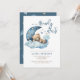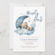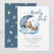 Nós podemos esperar Chá de fraldas Convite com ursinho de pelúcia bonitinho dormindo na nuvem azul inchada e na lua e estrelas da meia-crescença. É um convite para chás de fraldas. Avise a todos que você pode "esperar muito" com este charmoso e neutro convite! Apresentando uma adorável design de um ursinho de pelúcia adormecido aninhado numa lua crescente, rodeado por nuvens fofinhas e estrelas cintilantes, este convite dá o tom perfeito para uma celebração sonhenta e sincera. Com cores suaves e neutras, é ideal para acolher um menino ou uma menina.
