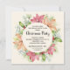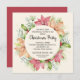 Uma coroa de poinsetos cor-de-rosa e pêssego acentuou-se com folhas e bagas ocas, folhas de eucalipto e agulhas de pinheiro com os detalhes da festa de Natal em caracteres quicos. Perfeito para convites de festas caseiros, convites de festas de escritório, festa de janto de férias ou qualquer outra ocasião de inverno. **O tamanho SQUARE requer postagem extra.
