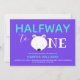 Um bebê meio convite de aniversário com um tema de urso polar em roxo, chato e branco. Ele apresenta um rosto bonito de urso como a primeira letra da palavra "Um". Simplesmente personalize este convite, adicione-o ao seu carrinho e divirta-se a celebrar os primeiros seis meses do seu bebê!
