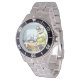 Esta design é de polícia em uma moto. O policial está em um uniforme de pilice sentado na moto já para ir. Esta polícia em uma design de motocicleta parece excelente neste relógio