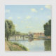 Le Pont Du Chemin De Fer, Pontoise. Camille Pissarro. Paisagem primavera em cores claras. Na margem de um largo rio há uma estrada e uma grande árvore. Há uma ponte sobre o rio. Do outro lado está uma cidade pequena. Há pequenas nuvens no céu azul. Reprodução de famosas imagens de arte no dominio público.